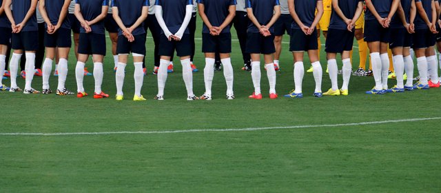 Με απόλυτη προσήλωση, οι παίκτες της Νότιας Κορέας ακούνε τις οδηγίες του προπονητή τους στην προπόνηση στο στάδιο στην Cuiaba.