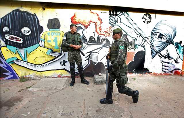 Βραζιλιάνοι αστυνομικοί στέκονται δίπλα σε γκράφιτι κατά της διοργάνωσης.