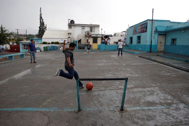 Μετανάστες στην Κεντρική Αμερική παίζουν ποδόσφαιρο μετά από τον αγώνα του Παγκοσμίου Κυπέλλου μεταξύ Γαλλίας και Ονδούρας.