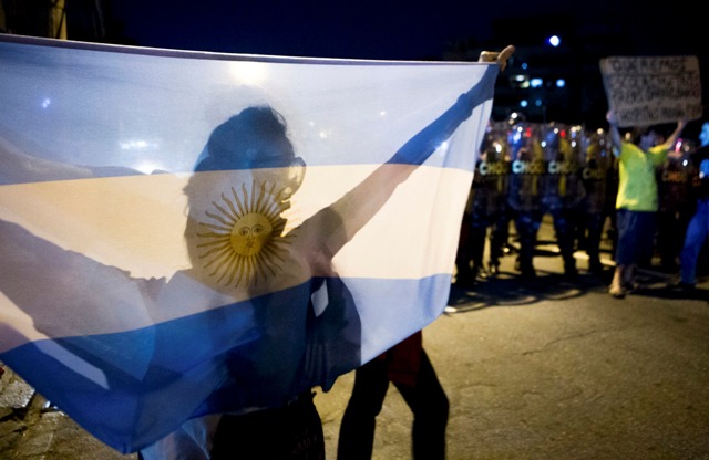 Σε διαμαρτυρία κατά του Μουντιάλ, ένας διαδηλωτής κρατά μια σημαία της Αργεντινής.