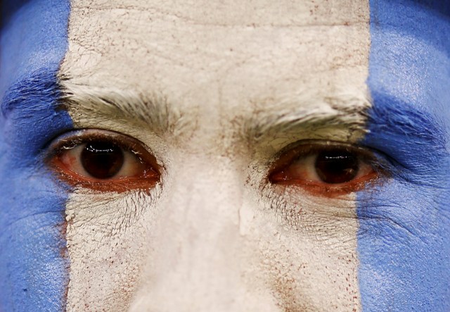 Οπαδός της Αργεντινής έχει βάψει το πρόσωπό του στα χρώματα της ομάδας του ενόψει του πρώτου αγώνα της Εθνικής Αργεντινής στο Παγκόσμιο Κύπελλο.