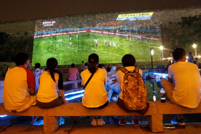 Στην αρχαία πόλη Nanjing στην περιοχή Jiangsu της Κίνας οι κάτοικοι παρακολουθούν έναν αγώνα του Μουντιάλ. Ο αγώνας προβάλλεται στο τείχος της πόλης το οποίο χρονολογείται στη δυναστεία των Ming (1368 – 1644).