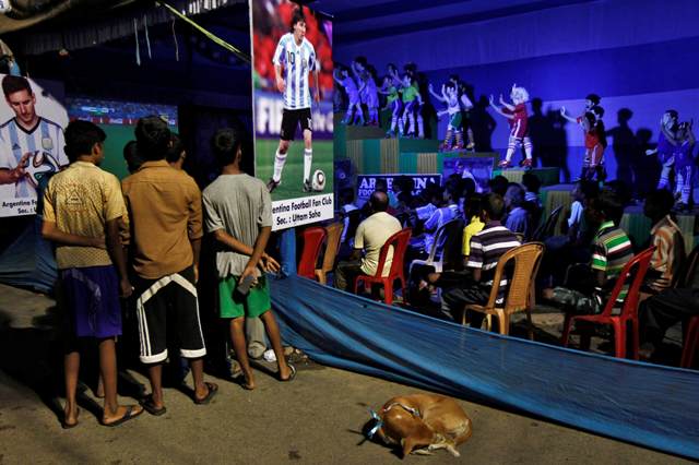 Ινδοί οπαδοί βλέπουν έναν αγώνα του Μουντιάλ σε οθόνη που έχει τοποθετηθεί στο δρόμο σε ένα ειδικό κιόσκι για τους φιλάθλους της Αργεντινής!