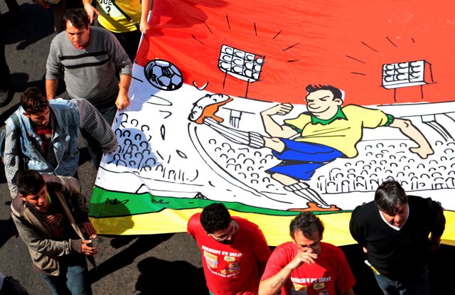 Πορεία διαδηλωτών με πανό με προορισμό το Εθνικό Στάδιο της Βραζιλίας. Οι διαδηλωτές διαμαρτύρονται για το υπέρογκο κόστος του Μουντιάλ.