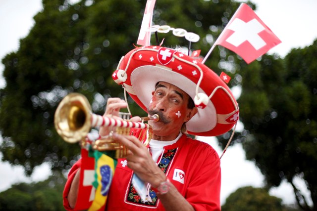 Οπαδός της Ελβετίας οδεύει προς το γήπεδο με την τρομπέτα του για τον αγώνα με το Εκουαδόρ.