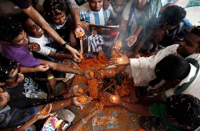 Ινδοί οπαδοί της ομάδας της Αργεντινής κάνουν μια ξεχωριστή τελετή-προσευχή για την επιτυχία της ομάδας τους δίπλα σε μια εικόνα του Μέσι.