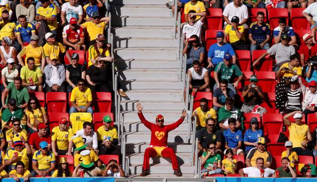 Φωτογραφία από τις κερκίδες στον αγώνα Ελβετία – Εκουαδόρ. Εκτός από τους… παραδοσιακούς οπαδούς, ο φίλαθλος – μασκότ στα σκαλιά ξεχωρίζει.