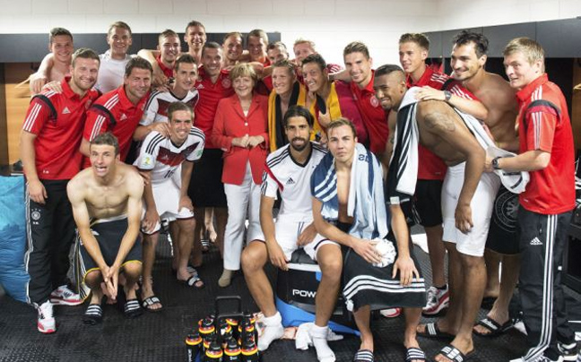 Ποιος είναι ο καλύτερος τρόπος για να γιορτάσει κανείς μια μεγάλη νίκη; Παρέα με την καγκελάριο Γερμανίας σκέφτηκαν οι παίκτες του Γιόακιμ Λεβ και την καλωσόρισαν στα αποδυτήρια μετά το τέλος του αγώνα, σύμφωνα με την Daily Mail. Εκείνη δεν έκρυβε τη χαρά της και δεν παρέλειψε να φωτογραφηθεί με την ομάδα έχοντας ένα πλατύ χαμόγελο στα χείλη.