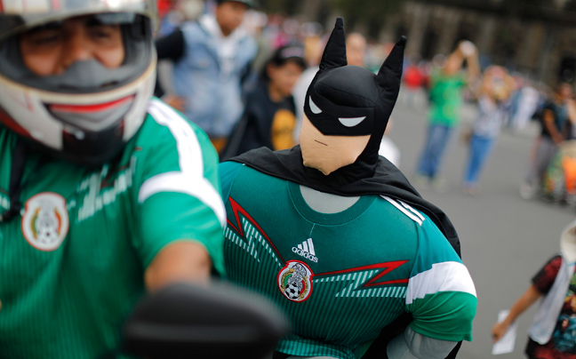 Ένας οπαδός του Μεξικού πήρε μαζί του και τον… Μεξικανό Batman για να απολαύσει τον αγώνα της χώρας του κόντρα στην Βραζιλία. Η φωτογραφία τραβήχτηκε στην πλατεία Zocalo στο Μεξικό.