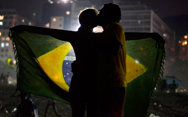 Οπαδοί της Βραζιλίας φιλιούνται κατά τη διάρκεια παρακολούθησης του αγώνα Μεξικό-Βραζιλία στην περίφημη παραλία Copacabana.