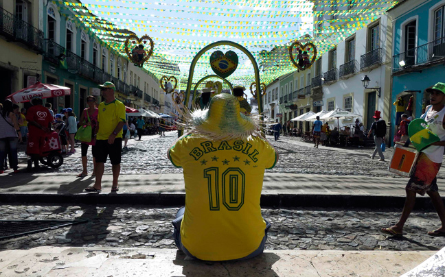 Ένας οπαδός της Βραζιλίας βρίσκεται κάτω από τον στολισμό για το Παγκόσμιο Κύπελλο της Βραζιλίας στη γειτονιά του Pelourinho στο Σαλβαδόρ. Η φωτογραφία τραβήχτηκε πριν τον αγώνα της Βραζιλίας κόντρα στο Μεξικό.