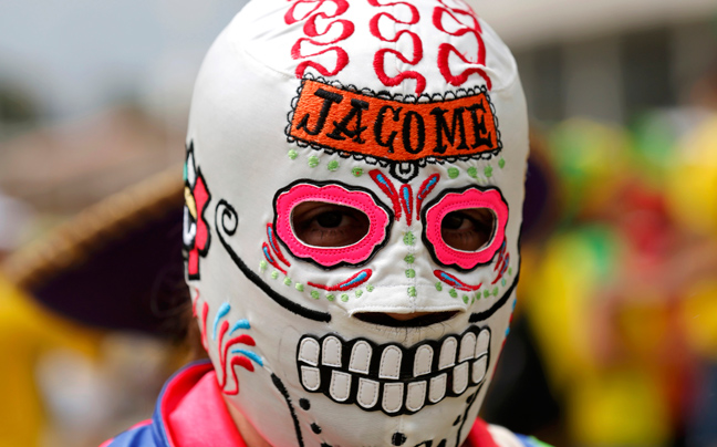 Με μία μάσκα αγώνων πάλης ποζάρει ένας φαν του Μεξικό την ώρα που φτάνει στο Castelao για το ματς της χώρας του με τη διοργανώτρια Βραζιλία.