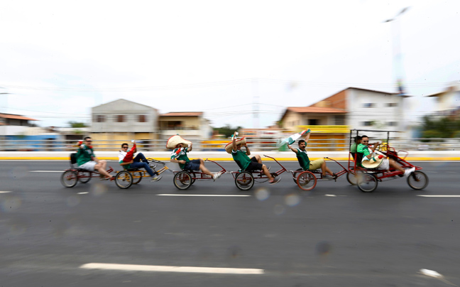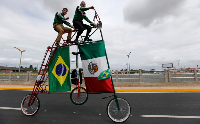 Οι οπαδοί του Μεξικό φτάνουν με τα ποδήλατά τους στο στάδιο για το ματς του πρώτου ομίλου του Παγκοσμίου Κυπέλλου με τη Βραζιλία.