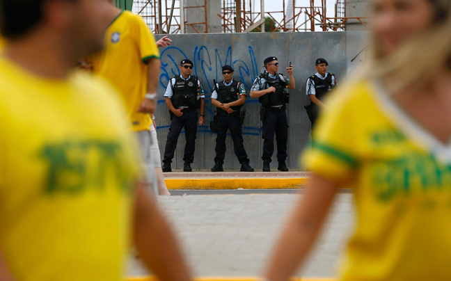 Δίπλα από μια ομάδα αστυνομικών περνούν βραζιλιάνοι οπαδοί για να φτάσουν στο γήπεδο στη Fortaleza.