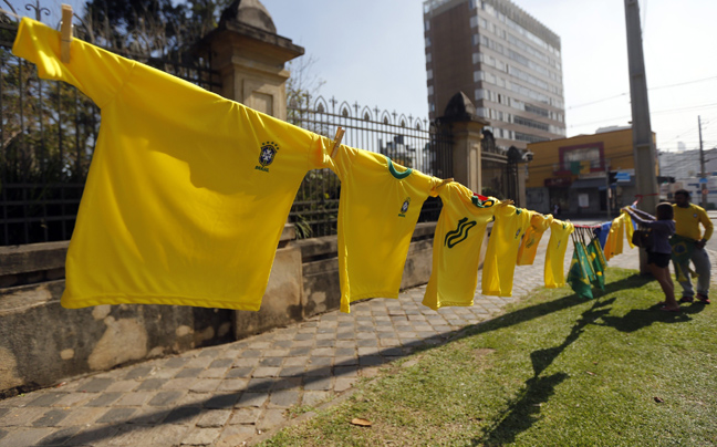 Πάγκος με μπλουζάκια της Βραζιλίας προς πώληση στο Curitiba.