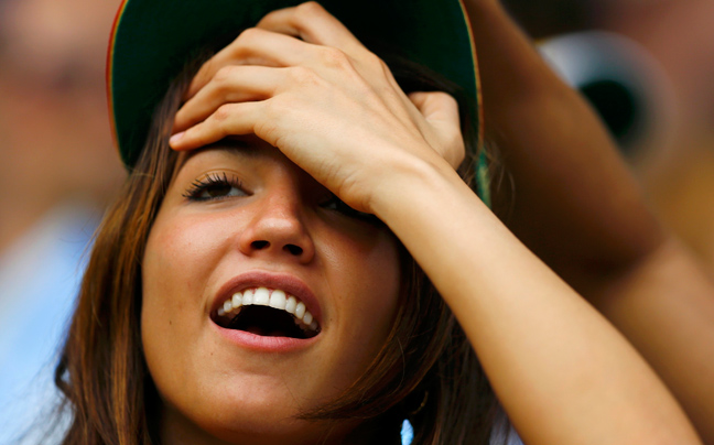 Μια οπαδός της Βραζιλίας περιμένει με τις πλατφόρμες της την έναρξη του αγώνα.