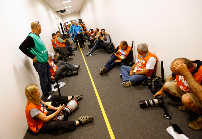 Φωτογράφοι περιμένουν να μπουν στην τελευταία προπόνηση της Βραζιλίας.