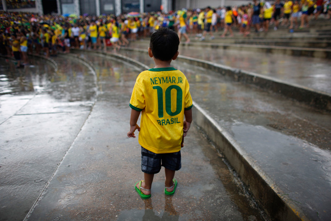 Με μπλούζα του Neymar ένα αγόρι παρακολουθεί τον κόσμο που συγκεντρώνεται για να απολαύσει τον αγώνα της Βραζιλίας.