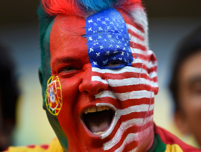 Οι σημαίες Πορτογαλίας και ΗΠΑ είναι ζωγραφισμένες στο πρόσωπο ενός οπαδού που περιμένει να ξεκινήσει ο αγώνας μεταξύ των δύο ομάδων.