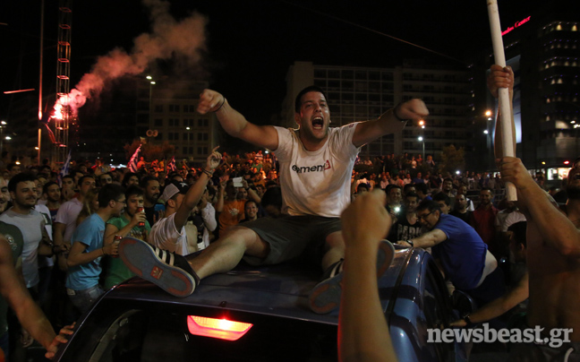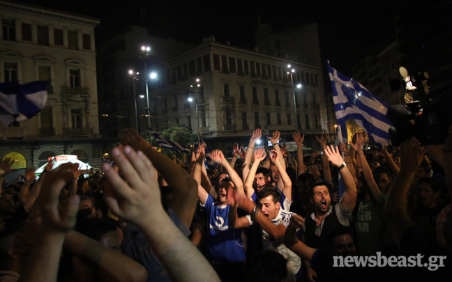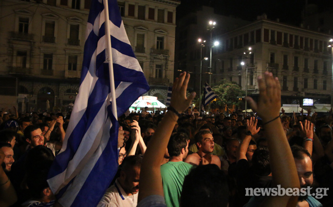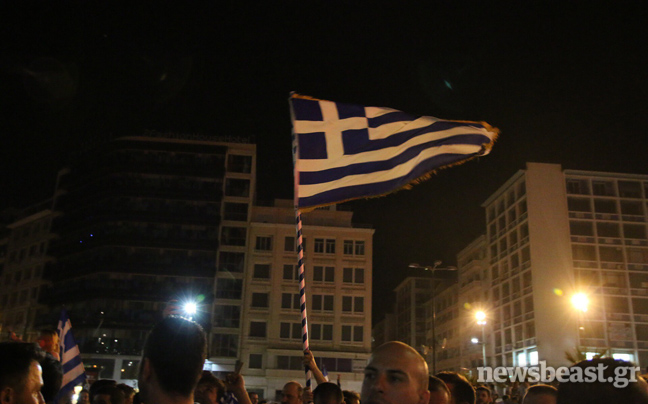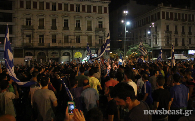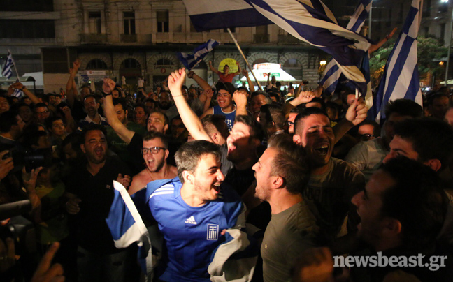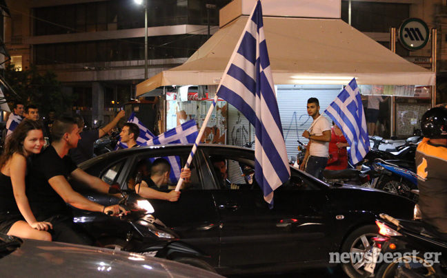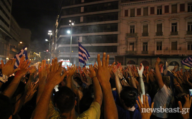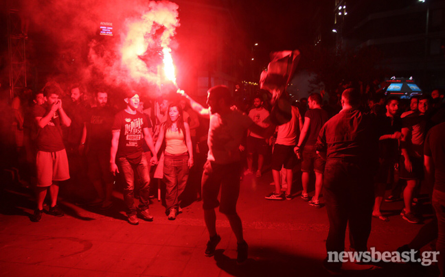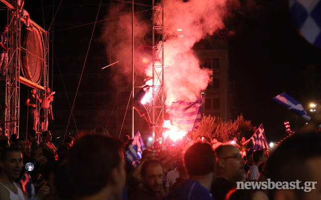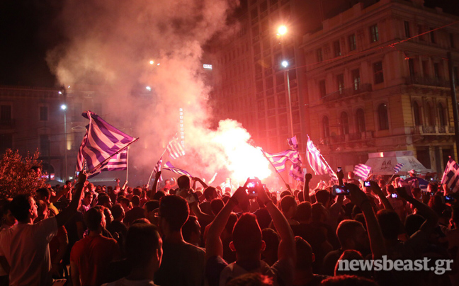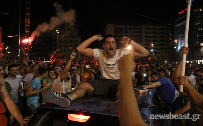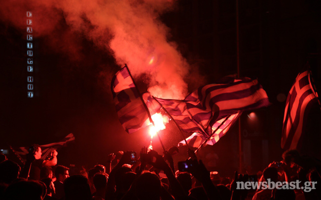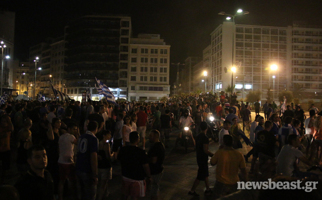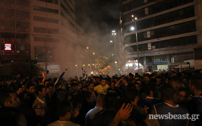 Στην πλατεία Ομονοίας επικρατεί ήδη το αδιαχώρητο με τους εκστασιασμένους Έλληνες να γιορτάζουν για την πρόκριση με ελληνικές σημαίες, συνθήματα και καπνογόνα, με το γλέντι να προδιαγράφεται να κρατάει μέχρι το πρωί!