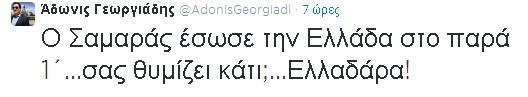 Την πρόκριση της Εθνικής σχολίασε στο twitter και ο κοινοβουλευτικός εκπρόσωπος της Νέας Δημοκρατίας, Άδωνις Γεωργιάδης.
