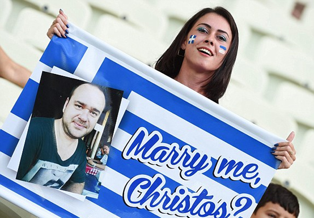 Η συγκεκριμένη οπαδός της Εθνικής έγραψε στα αγγλικά την πρόταση γάμου λίγο πριν τη σέντρα της αναμέτρησης της Ελλάδας με την Ακτή Ελεφαντοστού.