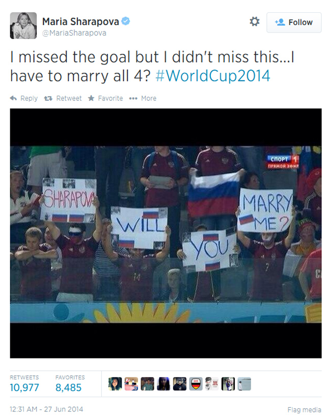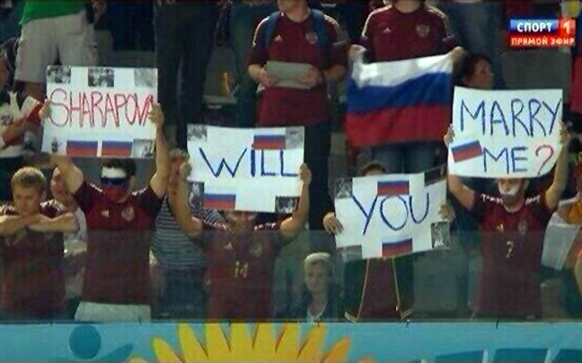 Της έστειλαν ένα μήνυμα και μάλιστα δημόσια από το γήπεδο της Βραζιλίας όπου διεξήχθη η αναμέτρηση, που έληξε ισόπαλη με 1-1. Σήκωσαν ο καθένας από ένα πανό και όλα μαζί έγραφαν «Σαράποβα θα με παντρευτείς;». Το μήνυμα τελικά έφτασε στον… προορισμό του μέσω Twitter. Η τεχνολογία στην υπηρεσία του επίδοξου γαμπρού, παρότι δεν ξεκαθάρισαν ποιος από τους τέσσερις έκανε την… πρόταση.
