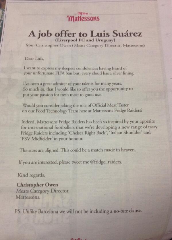 Συγκεκριμένα η εταιρία Mattessons προτείνει στον Σουάρες τη θέση του δοκιμαστή των προϊόντων της, για να… «αξιοποιήσει το πάθος του για φρέσκο κρέας», όπως αναφέρει η ανακοίνωση της αγγλικής επιχείρησης.
