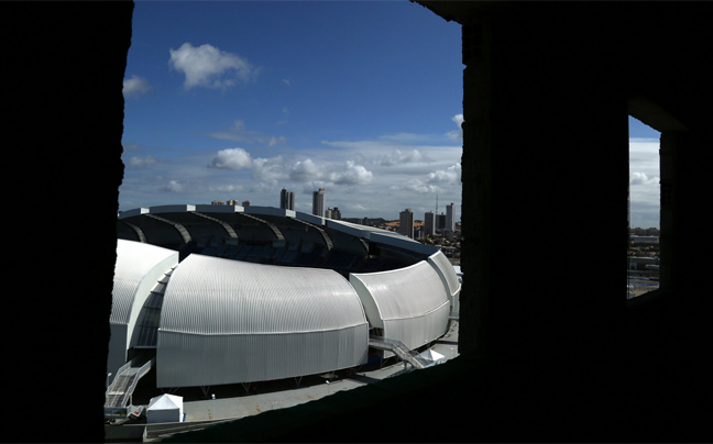 Μέσα από τα χαλάσματα ενός φτωχόσπιτου φαίνεται η πανάκριβη Αρένα ντας Ντουένας του Νατάλ.