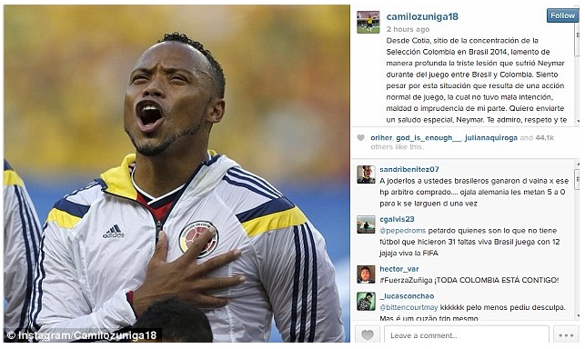 «Λυπάμαι πολύ για τον τραυματισμό του Νεϊμάρ, αν και νιώθω ότι προέκυψε από μία κανονική φάση, στην οποία δεν υπήρχε καμία κακή πρόθεση ή απροσεξία από μέρους μου. Θέλω να στείλω έναν ξεχωριστό χαιρετισμό στον Νεϊμάρ. Σε θαυμάζω, σε σέβομαι και σε θεωρώ από τους καλύτερους παίκτες στον κόσμο. Ελπίζω να επιστρέψεις γρήγορα και να δείξεις σε όλους πως το ποδόσφαιρο είναι ένα άθλημα γεμάτο αξίες, τις οποίες εφαρμόζω από 12 ετών και μέχρι σήμερα που πλέον είμαι επαγγελματίας ποδοσφαιριστής. Στους Βραζιλιάνους φιλάθλους, που έχασαν έναν από τους παίκτες της ομάδας τους για το Μουντιάλ, θέλω να πω ένα μεγάλο “ευχαριστώ” για τη στήριξή τους στην Κολομβία σε όσα παιχνίδια έδωσε στο Μουντιάλ», ανέφερε ο Σούνιγκα.