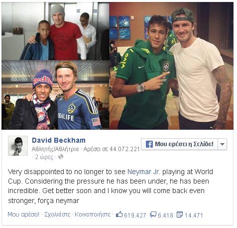Την απογοήτευσή του για τον τραυματισμό του Νεϊμάρ φανέρωσε σε μέσο κοινωνικής δικτύωσης ο Άγγλος σούπερ σταρ, Ντέιβιντ Μπέκαμ, ενώ του ευχήθηκε να επιστρέψει δριμύτερος στην αγωνιστική δράση.