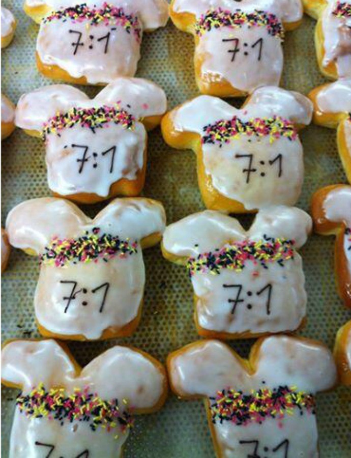 Ο οικογενειακός φούρνος του «Κλίνσι», που το 1990 είχε κατακτήσει το Μουντιάλ με τα «πάντσερ», στη Στουτγκάρδη γιόρτασε την περίσταση με μπισκότα γλασαρισμένα με το σκορ της αναμέτρησης.