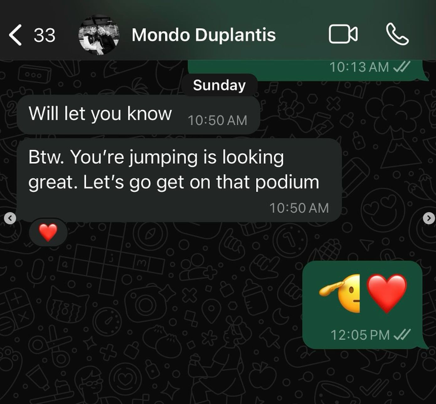 Σε μια ανάρτηση στο Instagram, ο Εμμανουήλ Καραλής αποκάλυψε το μήνυμα που του έστειλε ο Μόντο Ντουπλάντις πριν από τον τελικό: «Τα άλματά σου είναι πολύ καλά. Πάμε μαζί να ανέβουμε στο πόντιουμ».