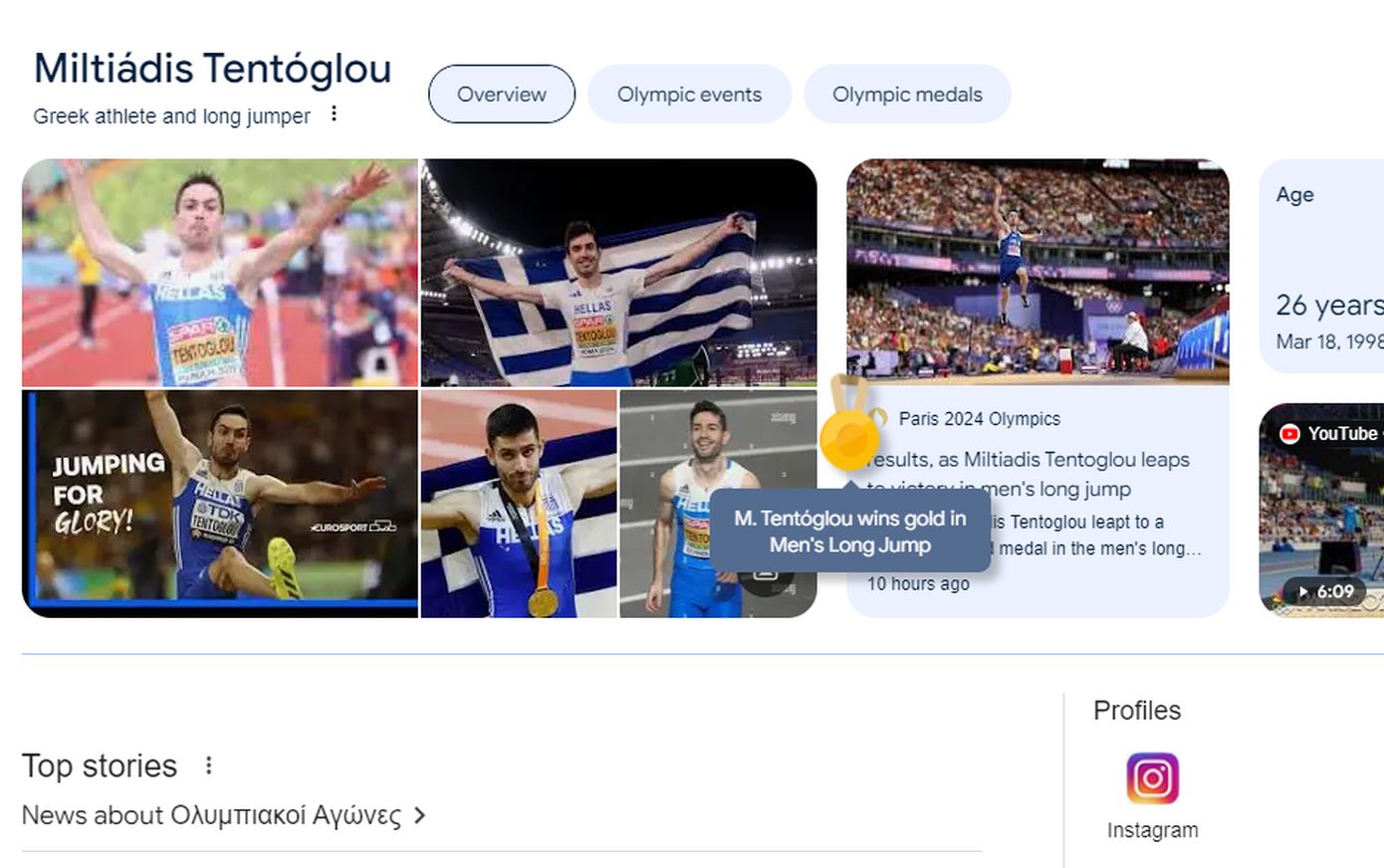 Έτσι, αν κάποιος πληκτρολογήσει το όνομα του Μίλτου Τεντόγλου στη Google, θα υπάρχει ενημέρωση για την κατάκτηση του χρυσού ολυμπιακού μεταλλίου από τον σπουδαίο έλληνα αθλητή.