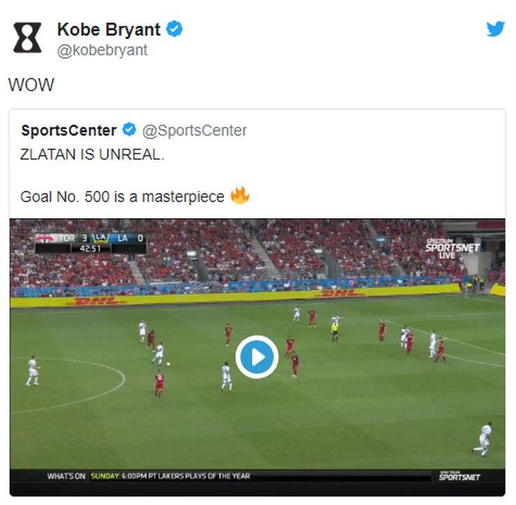 Μπορεί οι Λος Άντζελες Γκάλαξι να έχασαν με 5-3 στο Τορόντο από την τοπική ομάδα, στα πλαίσια της 28ης αγωνιστικής του MLS, αλλά αυτός που ξεχώρισε στην αναμέτρηση δεν ήταν άλλος από τον Ζλάταν Ιμπραΐμοβιτς. Ο Σουηδός άσος σημείωσε ένα τρομερό γκολ, από αυτά που ο ίδιος ξέρει καλύτερα από όλους. Μάλιστα, με αυτήν την «καρατιά», έφτασε στα 500 γκολ στην καριέρα του, κάτι που θα θυμάται σίγουρα σε όλη του τη ζωή. Και σύμφωνα με τον ίδιο, δεν θα είναι μόνο αυτός που θα μνημονεύει για πάντα την έμπνευσή του. «Είμαι χαρούμενος για την ομάδα του Τορόντο, γιατί θα μείνει στην ιστορία και θα τη θυμούνται ως το 500ο θύμα μου», τόνισε, με τον γνωστό του τρόπο. Το γκολ αυτό «τρέλανε» όλον τον ποδοσφαιρόφιλο πλανήτη. Μεταξύ αυτών και ο θρυλικός NBAer, Κόμπι Μπράιντ. Ένα «Ουόου» στον λογαριασμό του στο Twitter είναι ενδεικτικό.