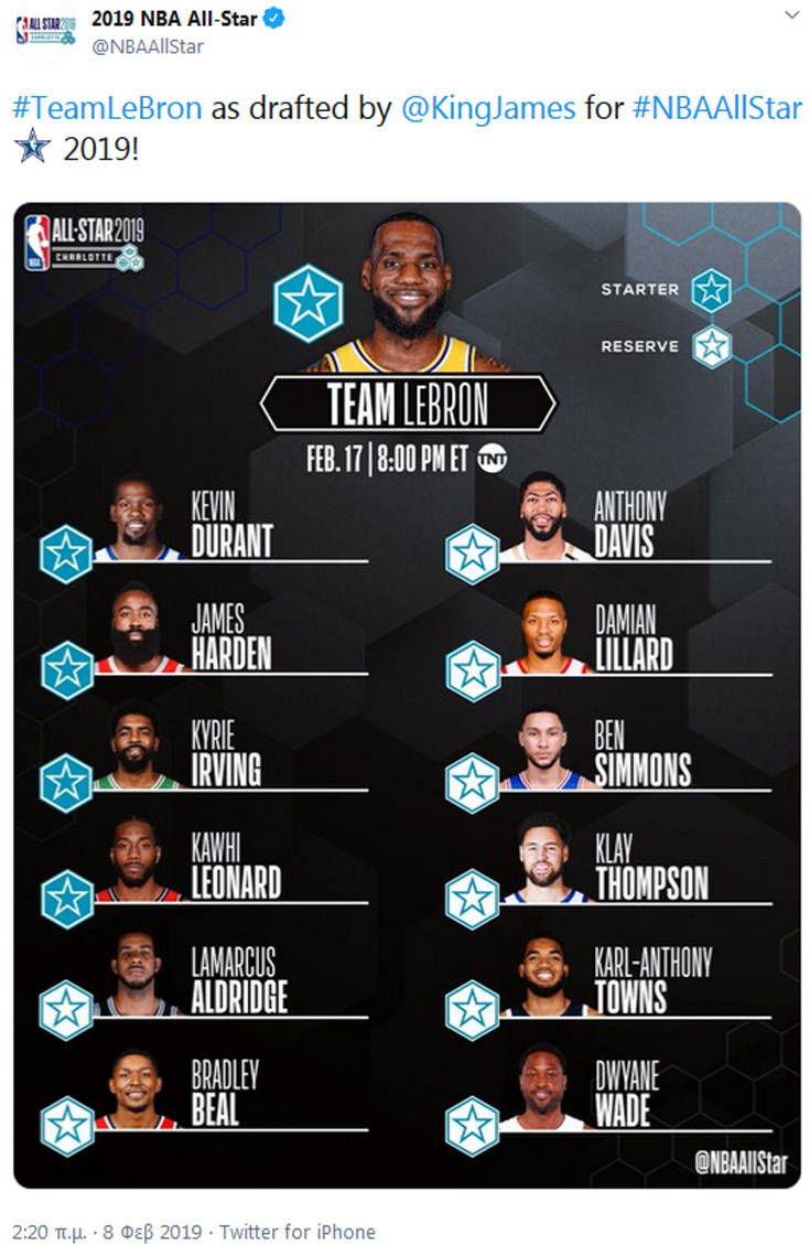 Στη συνέχεια ακολούθησαν και οι υπόλοιποι τρεις των αρχικών πεντάδα. Κάπως έτσι, η Team Giannis, θα έχει αρχική πεντάδα τους: Αντετοκούνμπο, Κάρι, Εμπίιντ, Τζορτζ, Ουόκερ, ενώ η Team LeBron, τους: Τζέιμς, Ντουράντ, Χάρντεν, Ίρβινγκ, Λέοναρντ.