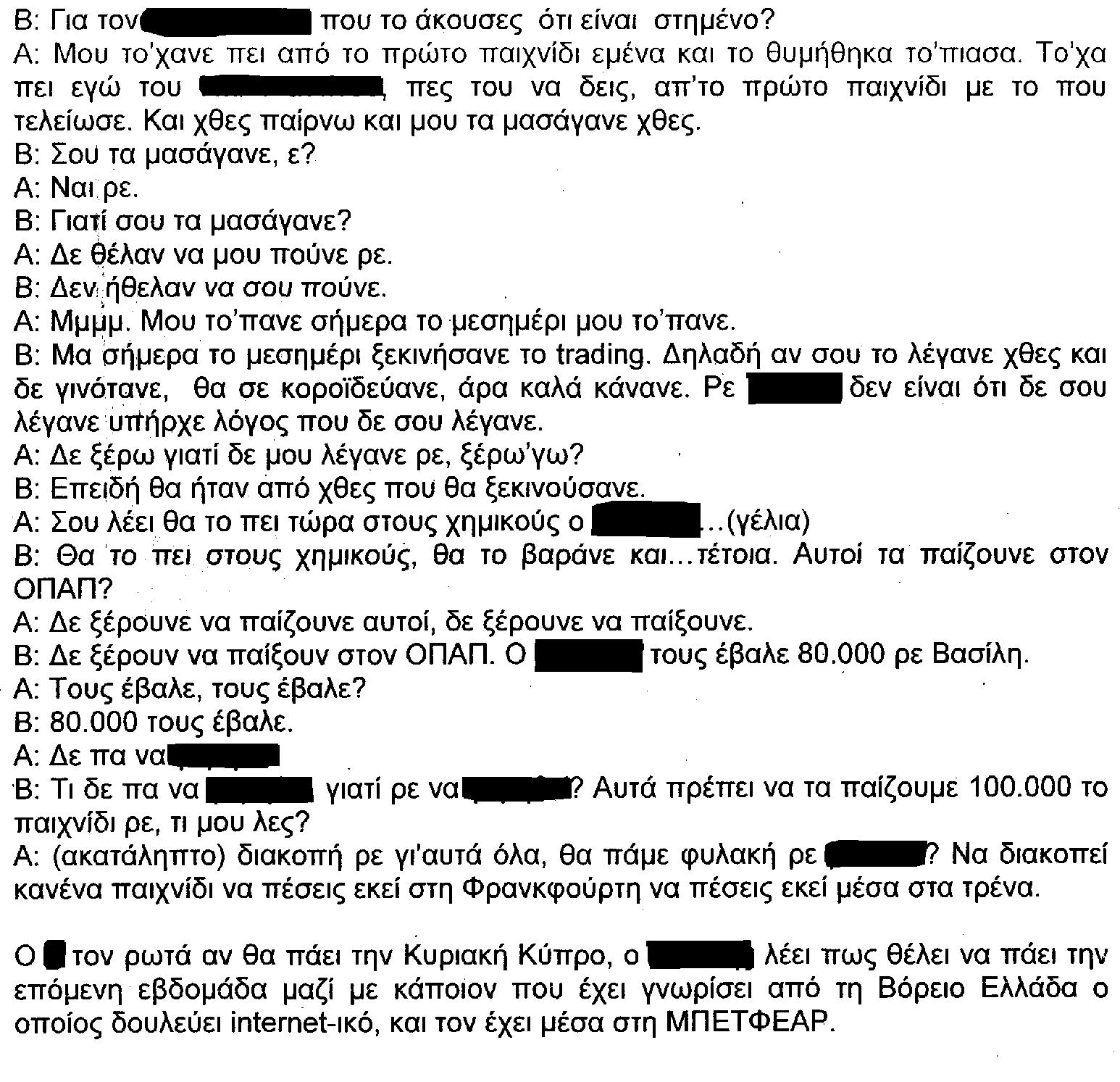 Νέοι διάλογοι από τη δικογραφία για τα στημένα παιχνίδια αποτυπώνουν όσα συνέβαιναν στο παρασκήνιο του ελληνικού ποδοσφαίρου με την εμπλοκή ηχηρών ονομάτων. Αναφορά ακόμη και για 100.000 το παιχνίδι γίνεται στον ακόλουθο διάλογο.