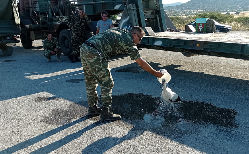 Φωτιά στη Λέσβο: Η στιγμή που στρατιωτικός δίνει νερό σε πελαργό που έχει καεί στα πόδια