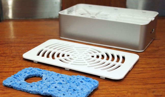 Το πλέον όμως ενδιαφέρον μέρος της συσκευής είναι η πίσω μεριά, καθώς εκεί βρίσκονται οι γρίλιες από όπου εξέρχεται ο αέρας του ανεμιστήρα! Το πίσω αυτό κάλυμμα είναι αποσπώμενο προκειμένου να μπορεί ο χρήστης να αφαιρέσει ένα μπλε σφουγγάρι το οποίο αφού βρέξει ελαφρά το επανατοποθετεί, κάνοντας έτσι τον αέρα που βγαίνει, όταν ο ανεμιστήρας λειτουργεί, πιο ψυχρό.