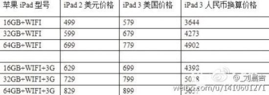 Όσο πλησιάζουμε στην ημέρα που θα αποκαλυφθεί το νέο iPad της Apple, διάφορα blogs διαδίδουν πολλές ανεπιβεβαίωτες πληροφορίες σχετικά με το πολυσυζητημένο tablet. Την εβδομάδα που μας πέρασε στα blogs που ασχολούνται μόνο με θέματα της Apple υπήρξαν αναρτήσεις σχετικά με την τιμή του iPad 3 ή iPad 2S ή iPad HD ή iPad 4G ή iPad SuperMAXXX ή όπως αλλιώς θα λέγεται. Οι bloggers είτε έχουν συγκεκριμένες πληροφορίες μέσα από την Apple είτε απλά πιστεύουν ότι το iPad 3 θα κοστίζει περισσότερο από το iPad. Σε κινεζική ιστοσελίδα για κοινωνικά δίκτυα δημοσιεύτηκε η φωτογραφία που ακολουθεί, στην οποία σύμφωνα με την ιστοσελίδα, αναγράφονται οι νέες τιμές. Οι ίδιες πηγές υποστηρίζουν ότι το iPad 3 16GB (μόνο με WiFi) θα κοστίζει 569 δολάρια, την ώρα που το iPad 2 στην ίδια έκδοση κόστιζε 499 δολάρια. Ωστόσο σύμφωνα με άλλα blogs, το iPad 3 θα έχει ακριβώς την ίδια τιμή με το iPad 2, δηλαδή 499 δολάρια για WiFi 16GB, 599 δολάρια για WiFi 32GB κ.ο.κ.