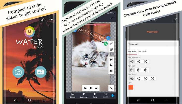 Δεν είναι φυσικά το μόνο app που το κάνει αυτό, παραμένει ωστόσο ένα από τα καλύτερα, παρέχοντας πολλές επιλογές εδώ. Γιατί επιτρέπει να προσθέσεις όχι μόνο οποιοδήποτε κείμενο ως watermark, και να παίξεις με γραμματοσειρές, μεγέθη και χρώματα, αλλά ακόμα και χειρόγραφα κείμενα ως υδατογραφήματα, γράφοντας απλώς πάνω στην οθόνη του κινητού.