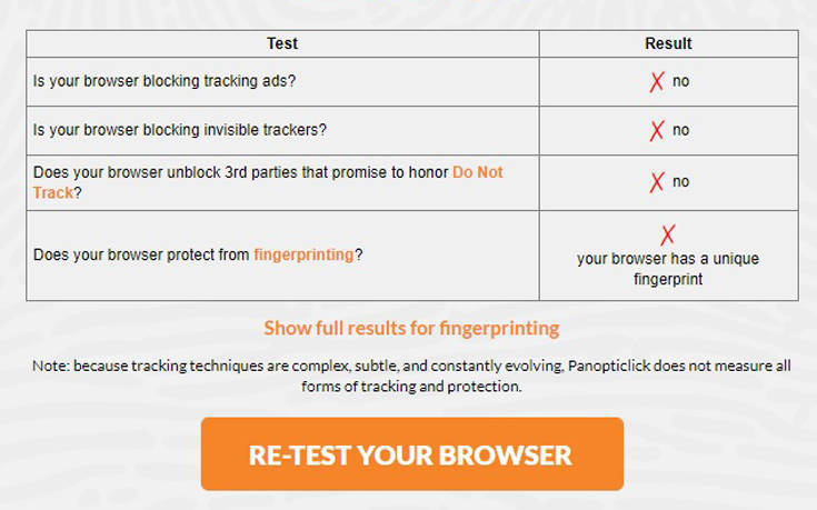 Αν θέλετε να δείτε μάλιστα πόσο γυμνοί είστε στις διαθέσεις κάποιων, κάντε κλικ εδώ και τρέξτε το Panopticlick τεστ που προσφέρει το Electronic Frontier Foundation, ώστε να μάθετε πόσο προστατευμένοι είστε από το ad tracking, ακόμα και το fingerprinting.