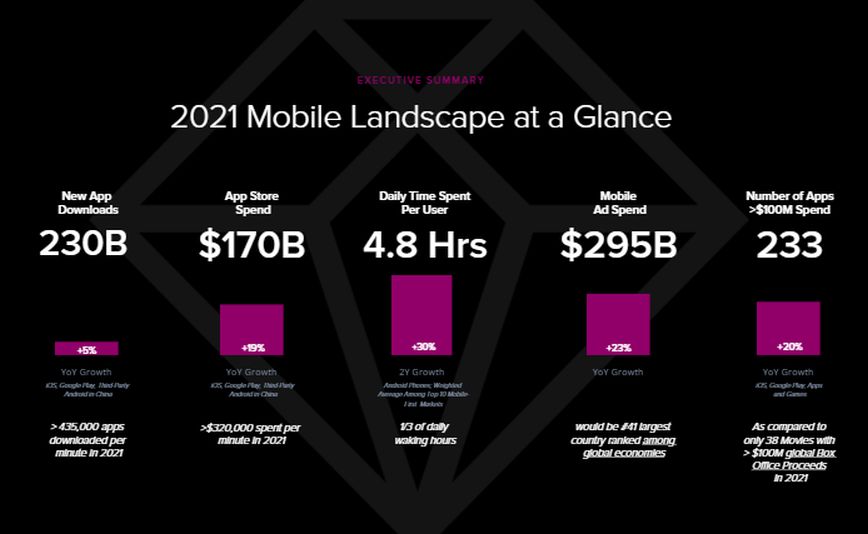 Το οικοσύστημα κινητής τηλεφωνίας γενικά παραμένει πολύ υγιές. Συγκεκριμένα, το 2021, κυκλοφόρησαν δύο εκατομμύρια νέες εφαρμογές και παιχνίδια, ενώ ο αριθμός των εφαρμογών με έσοδα πάνω από 100 εκατ. δολάρια, αυξήθηκε κατά 20%, σύμφωνα με την έκθεση.