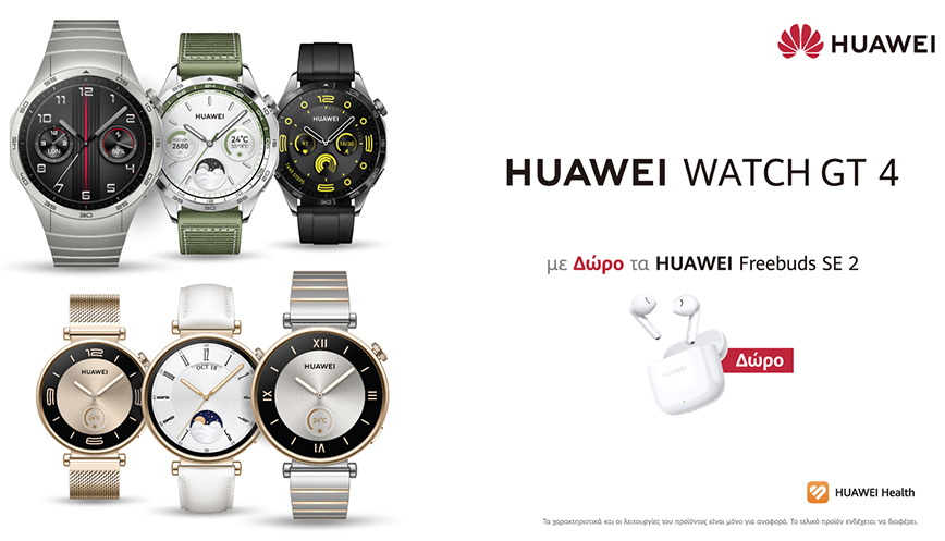 To HUAWEI WATCH GT4 – είναι διαθέσιμο στην Ελληνική αγορά μέσω του δικτύου καταστημάτων των επίσημων συνεργατών της Huawei, και για κάθε αγορά, οποιασδήποτε έκδοσης, παίρνετε δώρο τα καταπληκτικά ασύρματα ακουστικά HUAWEI Freebuds SE 2. Η προσφορά ισχύει έως το τέλος Σεπτεμβρίου ή έως εξαντλήσεως των αποθεμάτων.