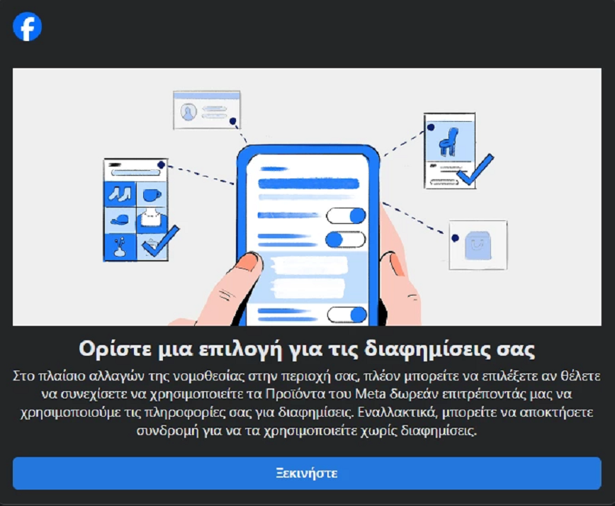 Ακολουθούν εικόνες από το Facebook, που δείχνουν τον τρόπο με τον οποίο η Meta ενημερώνει τους χρήστες της, αλλά και οι επιλογές που μπορούν να διαλέξουν: