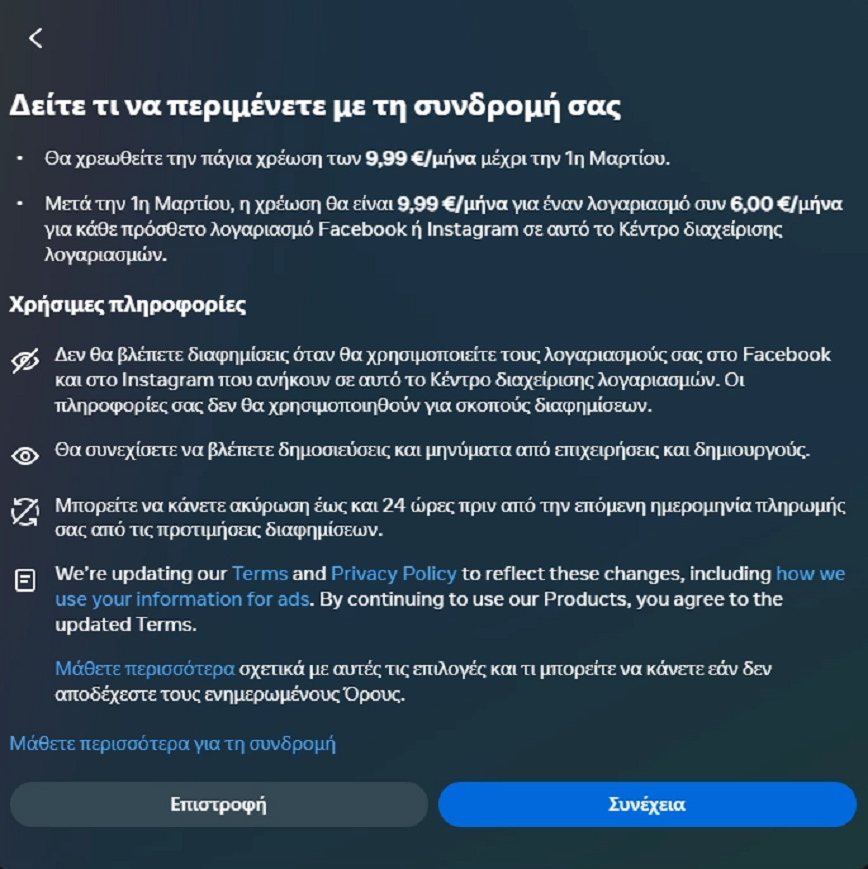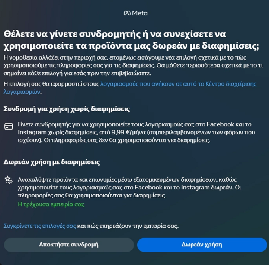 Τελικά ήρθε και στην Ελλάδα η προαιρετική συνδρομή σε Facebook και Instagram, σε περίπτωση που κάποιος θέλει να χρησιμοποιεί τα συγκεκριμένα social media χωρίς διαφημίσεις.