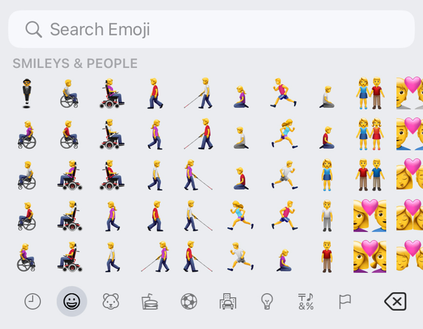Επιπλέον, προστίθενται έξι νέα emojis ανθρώπων που τρέχουν ή είναι σε αναπηρικό αμαξίδιο προς τη διαφορετική κατεύθυνση (δεξιά) από την ήδη υπάρχουσα (αριστερά). Καθένα από αυτά έρχεται με όλες τις επιλογές φύλου στα emoji μαζί με πέντε επιλογές τροποποίησης του τόνου του δέρματος, ανεβάζοντας το σύνολό τους σε 108, σύμφωνα με την Emojipedia.