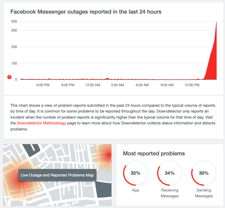 Όπως αναφέρει και το Down Detector τις τελευταίες ώρες τα προβλήματα ξεκίνησαν σήμερα περίπου στη 1:00 το μεσημέρι και μέχρι αυτήν την ώρα συνεχίζονται. Ορισμένοι χρήστες αναφέρουν ότι η ροή των μηνυμάτων “κολλάει” και δεν τους εμφανίζεται σωστά, προβάλλοντας τα τελευταία μηνύματα ενώ άλλοι επισημαίνουν ότι χάνονται μηνύματα.