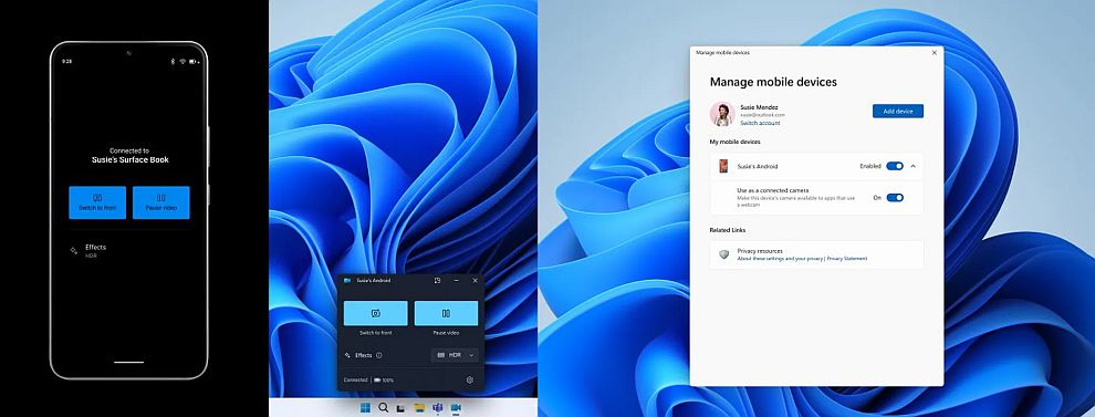 Αυτό το χαρακτηριστικό γίνεται μέσα από την εφαρμογή Phone Link, ενώ παράλληλα υπάρχει η επιλογή πρόσβασης του χρήστη στις πιο πρόσφατες φωτογραφίες του τηλεφώνου του. Αν είστε και εσείς Windows Tester, το μόνο που πρέπει να κάνετε για να ενεργοποιείτε το τηλέφωνό σας ως webcam στο PC σας, είναι να ανατρέξτε στο μενού ρυθμίσεων για Bluetooth και κινητές συσκευές και έπειτα στη διαχείριση συσκευών.