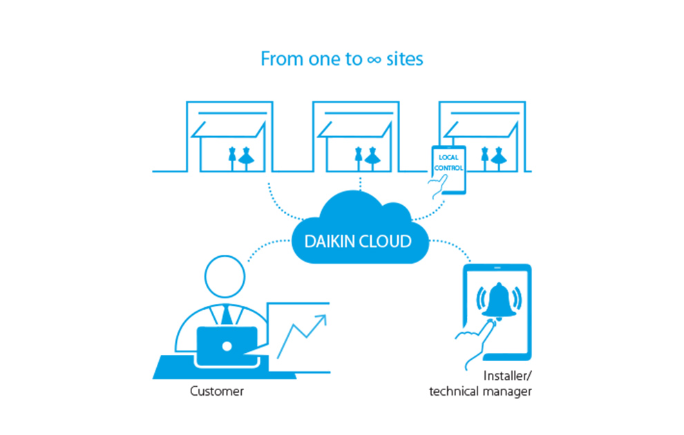 Η υπηρεσία Daikin Cloud σου επιτρέπει να διαχειρίζεσαι πολλαπλές τοποθεσίες από οποιαδήποτε θέση, κάτι που μπορεί να φανεί ιδιαίτερα χρήσιμο ειδικά σε περιπτώσεις αλυσίδων καταστημάτων με κεντρικό έλεγχο. Μέσω του Daikin Cloud μπορείς να παρακολουθείς την κατανάλωση ενέργειας, να έχεις πρόσβαση σε απομακρυσμένη υπηρεσία διάγνωσης και αρχικής αντιμετώπισης τυχόν προβλημάτων καθώς σε και προληπτική συντήρηση, για αύξηση της διάρκειας ζωής του συστήματος.